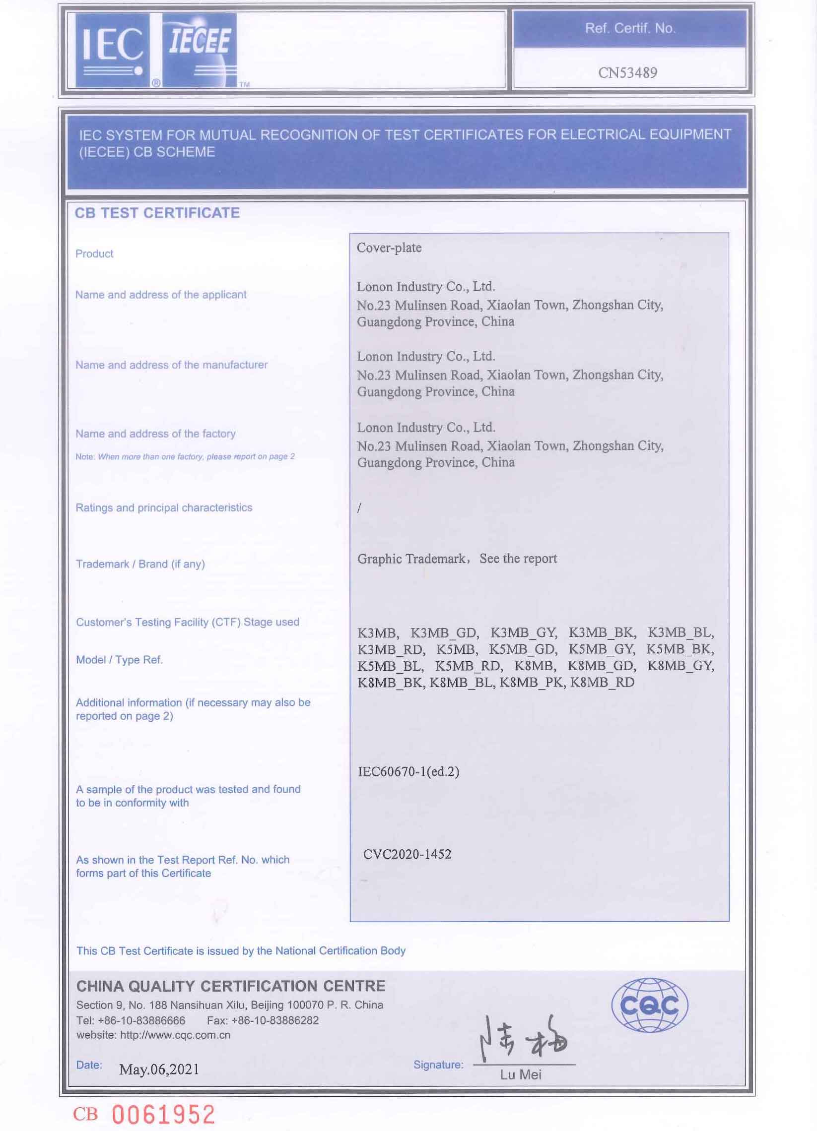 CN53489 K3K5K8 CB Test CERTIFICATE
